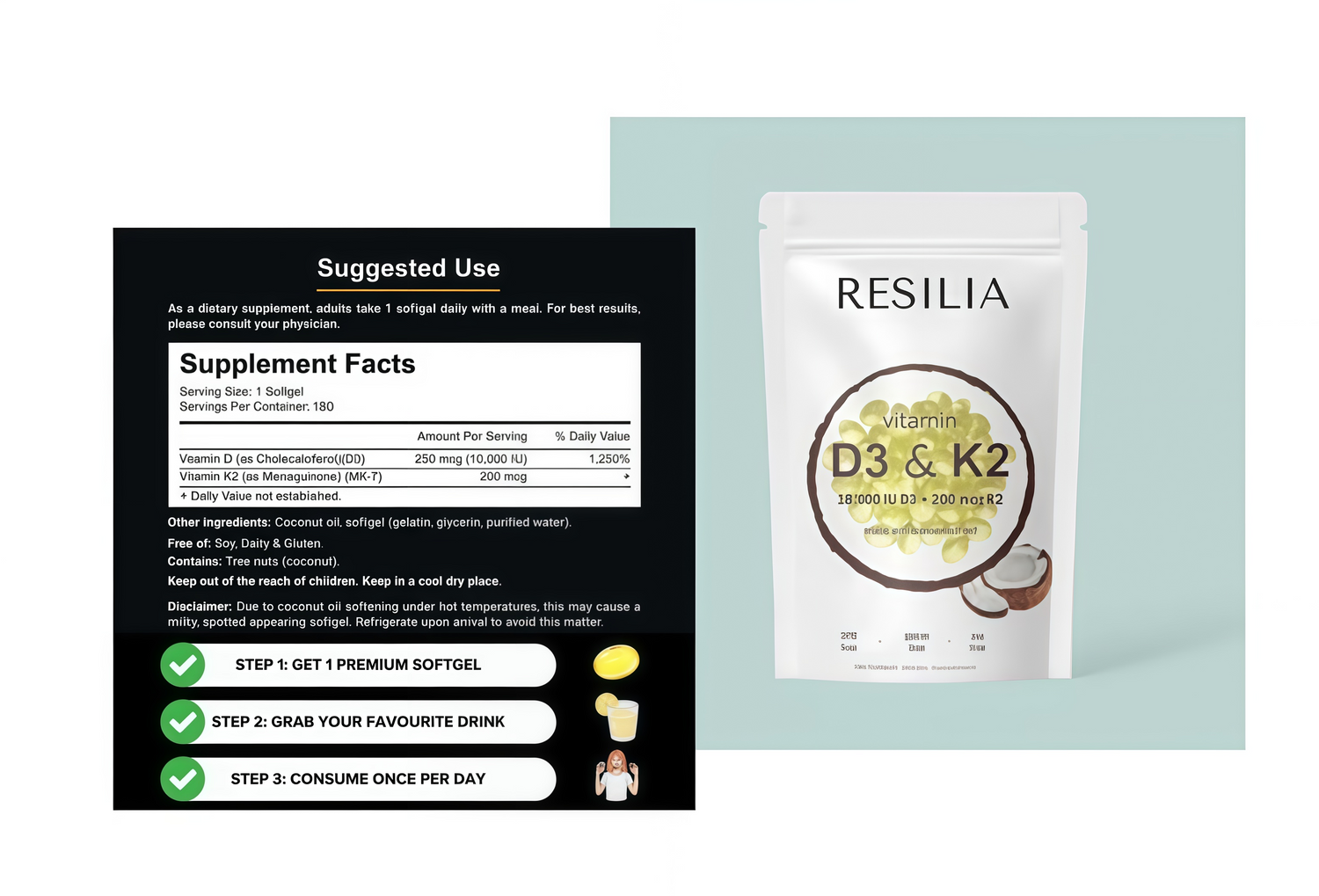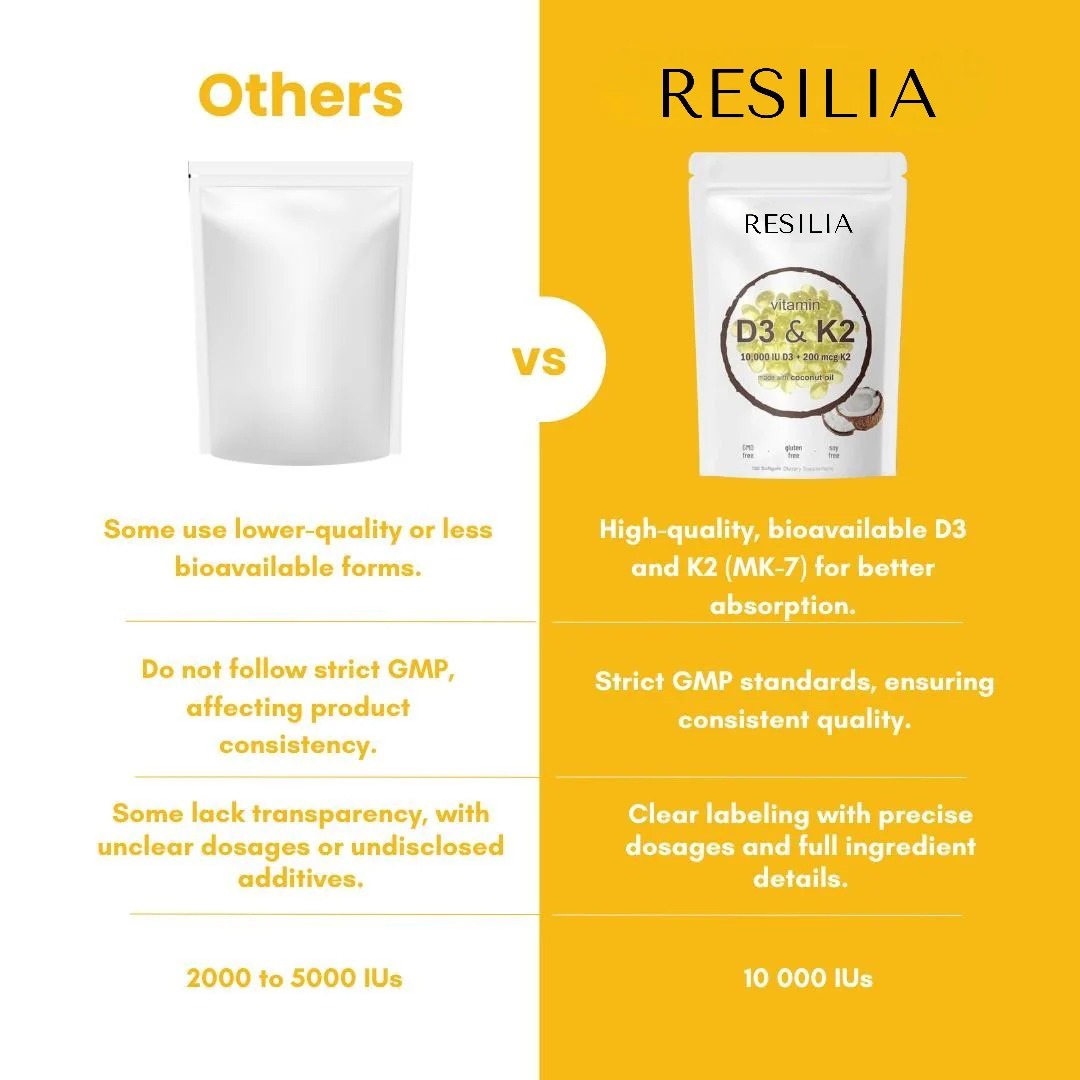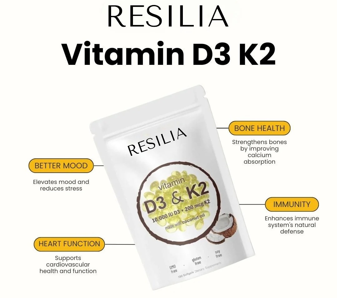 The Resilia Vitamin D3 10000 IU with K2 200 mcg, expertly designed to maximize health benefits by synergistically enhancing each vitamin's effectiveness.